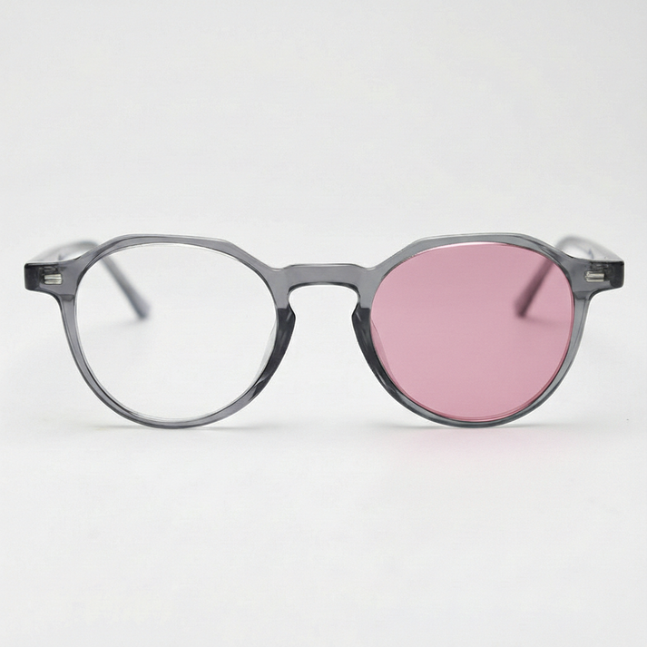 Pink Photochromic keeps up with changing light: clearer indoors, then deeper outdoors in sun - ideal for course days, coffee runs, and commutes that bounce between shade and open sky. It has that uv-activated pink lens shift in CR-39, with a soft rose activated tone that feels modern and wearable. Cherry in Grey anchors it with smoky translucent grey and a geometric panto silhouette in lightweight TR90, smooth at the bridge and temples. The result is one easy pair for changing plans and changing light.