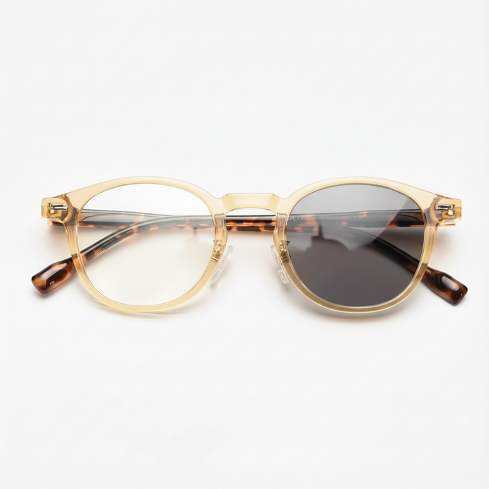 - Frame: Translucent honey-yellow round TR90 frame — tortoise temples add warmth while the grey activation stays crisp.
