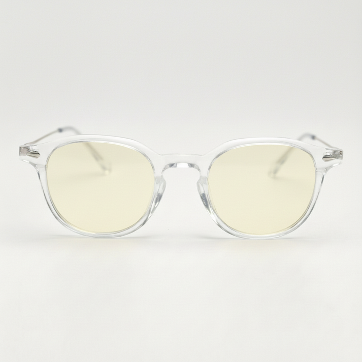 Under office LEDs and long sessions at a computer, blue light filtering lenses add a subtle warm tone that takes the edge off harsh indoor glare while keeping the look nearly clear. Built for screen work, video calls, and late-night reading, they feel screen-friendly without making the world look tinted. Lora’s clear round TR90 frame keeps it light and airy with flexible, ultra-light comfort. The result is a clean, minimalist pair that works from desk to dinner.