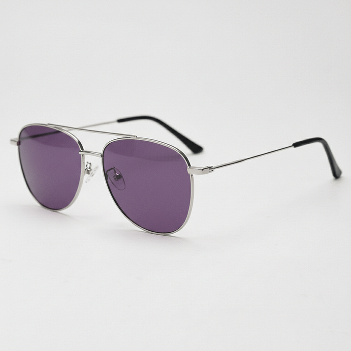 A violet tint lens brings a cool, expressive cast for bright days, the kind of color that makes simple outfits feel styled. Zoe's Silver aviator frame keeps it clean: crisp metal lines, full-rim structure, and adjustable nose pads for a steady sit while you're out. Wear it for festival afternoons, waterfront weekends, and street-photo walks when the light is loud. It's bold, but still polished in silver. The tint does the talking; the frame stays quiet and sharp behind it.