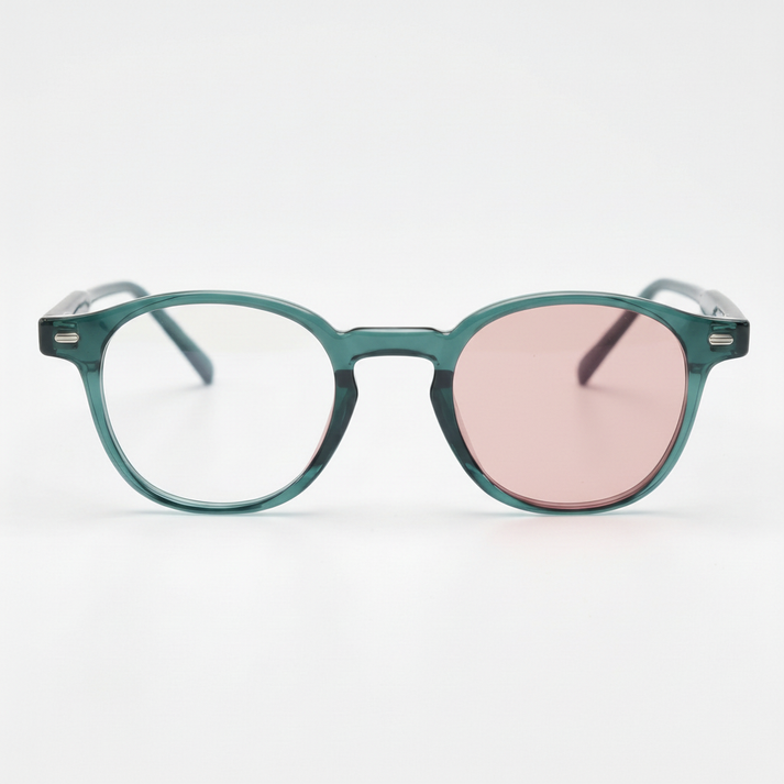 - Green round frame: Transparent rims with deeper temples create a clean, modern-vintage look that photographs well.